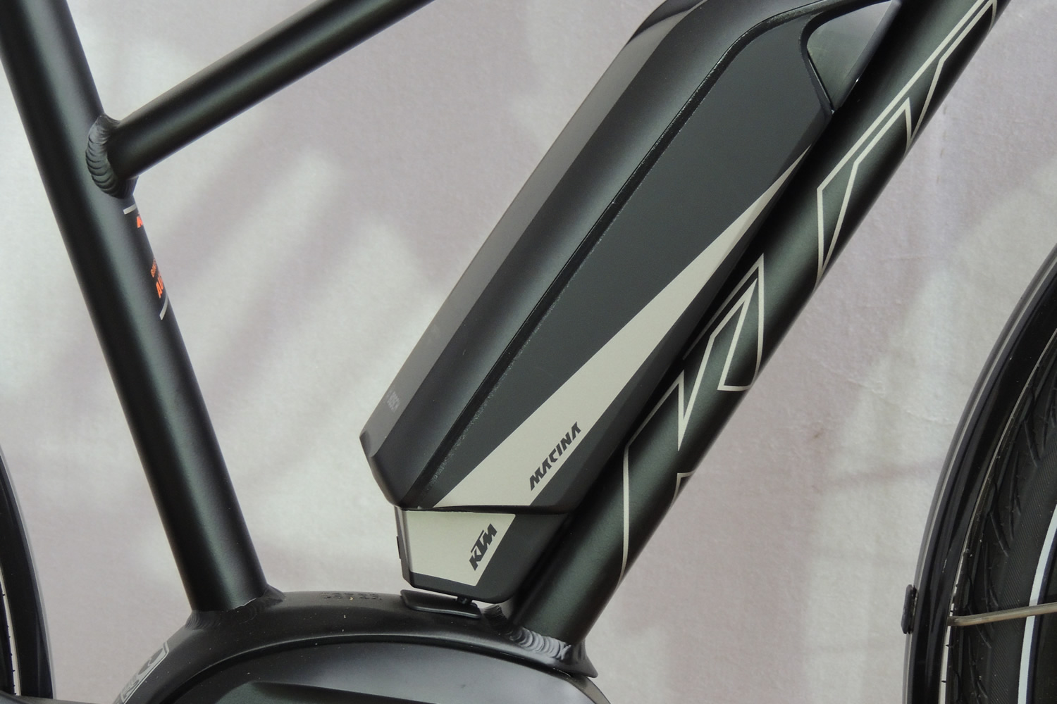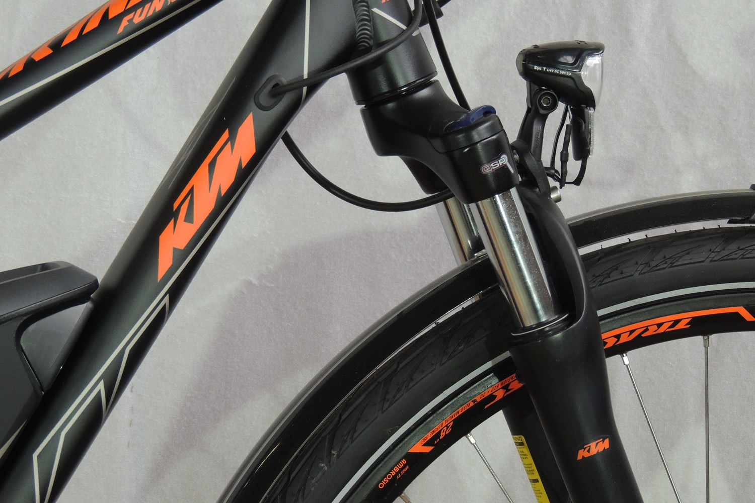 Das KTM MACINA Fun 10 P5 wird mit einem klassischen Diamant-Rahmen vertrieben. Die schöne Lackierung in black matt (orange) wurde für den Diamant-Rahmen ausgewählt. Die aufladbare Batterie gehört zur Ausstattung des Trekkingbike. Das Elektrofahrrad verfügt über eine grössere Akkukapazität von 500 Wh. Die Position des Akku befindet sich am Unterrohr. Ausgestattet ist das Bike mit einer NEX HLO Coil Gabel von SR SUNTOUR. Ein sehr gutes Überrollverhalten, eine gute Laufruhe und eine höhere Geschwindigkeit wird durch die 28 Zoll Laufradgrösse erzielt.